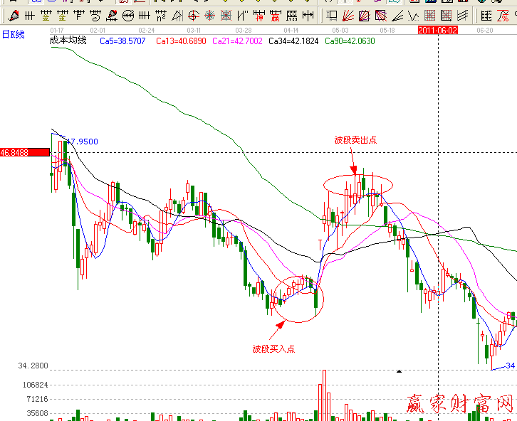 賣出點(diǎn)回調(diào)整理波段操作:在上面的實(shí)例中提到了回調(diào)整理波段操作,實(shí)例中的回調(diào)整理波段操作是用股價下跌過程中的短時回調(diào)上漲進(jìn)行波段買賣操作。股價在下跌趨勢中,并不會一直下跌,從最高價一路下跌至最低價的走勢過,中出現(xiàn)短時間的回調(diào)上漲整理走勢,投資者可以在下跌過程中出現(xiàn)短時回調(diào)上漲里時進(jìn)行波段買賣操作。在回調(diào)上漲整理初期,股價出現(xiàn)止跌企穩(wěn),成交量開始有增加時投資者可入市購買;在回調(diào)上漲整理末期,股價出現(xiàn)滯漲企穩(wěn),成交量始有所減少時,投資者可離市賣出。在下降趨勢中利用回調(diào)整理做波段買賣操作過程中,股價會在前期形成的支撐位和阻力價位之間進(jìn)行回調(diào)上漲整理。股價在支撐位止跌企穩(wěn),成交量增大則是入信號;股價在阻力位滯漲企穩(wěn),成交量減小則是賣出信號。 回調(diào)整理走勢不僅會出現(xiàn)在下降行情中,也會出現(xiàn)在上漲行情中。在上漲趨勢亍情中做回調(diào)整理波段買賣操作時,回調(diào)整理波段賣出點(diǎn)價位首選前期上漲高點(diǎn),股價觸及前期上漲高點(diǎn)而無法形成突破時,則應(yīng)止贏獲利,若成交量放量,股價成突破時,可繼續(xù)持有,持股待漲。