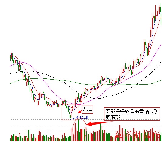 “底部放量”為典型的結束調整、走勢逐步轉強的信號,也是廣大投資者進行圖表分析時努力尋找的底部形態。一只個股在長期盤底之后,成交量突破出現一個類似于“小山堆”一樣的放量形態,這種放量形態,可稱為“堆量”。成交量形態要同股價形態結合看,一般股價在底部出現堆量之后,股價會隨量上升。