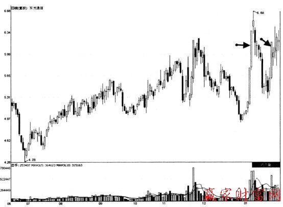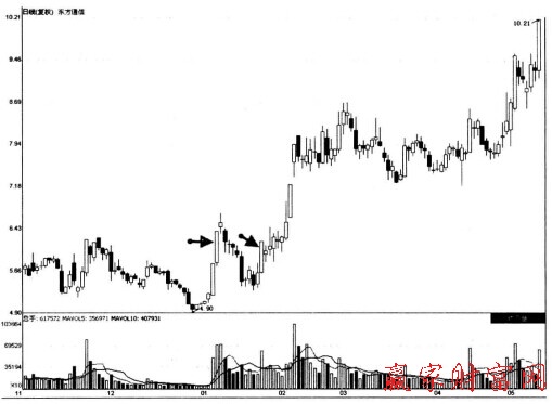 上圖所示為東方通信2010.06.23至2011.01.28期間走勢圖。此股在向上沖擊原來的盤整區時,出現了這種寬幅展蕩中的再度漲停板形態,這是個股隨后有望突破上行的信號。在實盤操作中,此時,我們可以積極地買股入場。下圖所示為此股隨后的走勢情況。