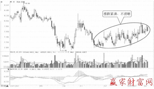如圖1所示,2011年11月底至2012年2月初,萬科A (000002)日K線圖上的日K線漲跌緊湊,呈現出緩緩上移的走勢。投資者在買入此股后,整體漲幅較小,但時間成本較高。因此,投資者可采用觀察60分鐘K線圖的方式尋找合適的買賣點,進行短線波段操作。如圖2所示。