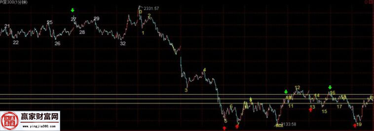 從同一級別上的角度上看,5分鐘的同級別走勢分解點并不一定就是1分鐘走勢的分解點,理解了這一點,對同級別分解的認識才會有突破性的進展。例如下圖走勢中1分鐘下跌,在圖中最低點有一個5分鐘盤整空頭井,但在這個地方并沒有1分鐘的買點,按1分鐘分解,中樞震蕩依舊。