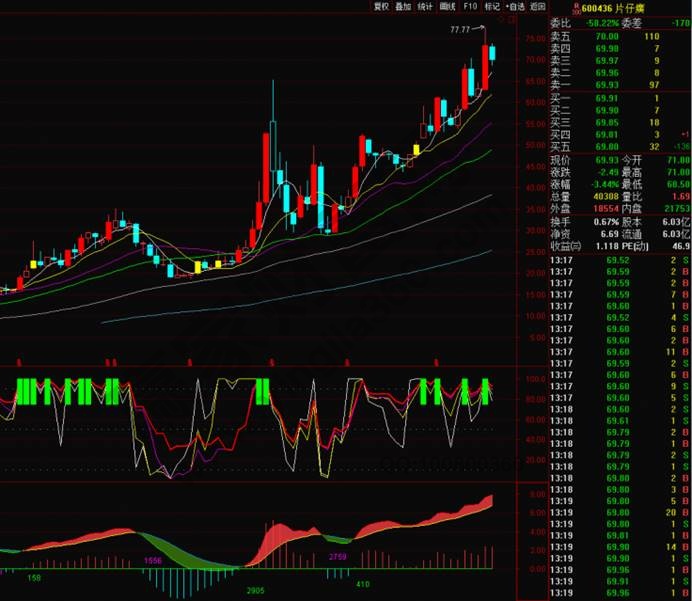 對于投資者抄底來說,首先就是備選股票池的建立,這個(gè)方法的條件就是,大家應(yīng)該選擇月線向上形態(tài)的個(gè)股。簡單的定義這個(gè)走勢的形態(tài)包括:月線紅三兵和月線5、10、20周期均線多頭發(fā)散。如果月線的上升形態(tài)沒有被動(dòng)打破的話,那么在大盤止跌后可以在抄底備選股中宣召跌到位的個(gè)股來進(jìn)行抄底,此時(shí)大家可以通過DKDB指標(biāo)作為抄底的輔助指標(biāo),我們來看片仔癀走勢圖。