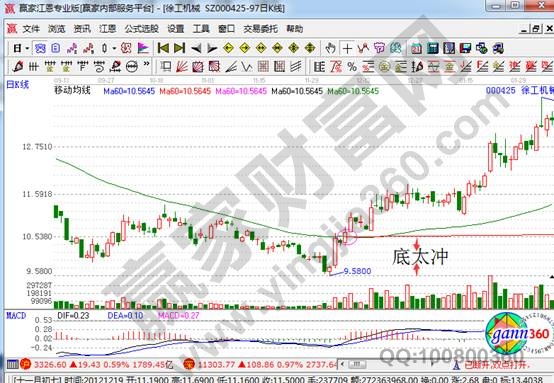 股票底太沖是怎樣的走勢(shì)?它指的就是股價(jià)長(zhǎng)期下跌的末端,在股價(jià)上穿到60日均線的交叉點(diǎn)作一水平線,水平線以下的部分就是底太沖。如下圖所示。