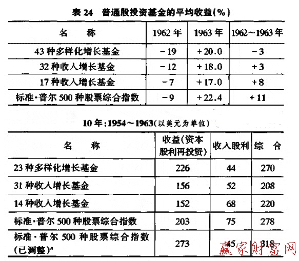 然而,總體看來,完全投資于普通股的基金,在很多年里沒有能獲得如同標準.普爾500種股票平均值所顯示的那樣好的收益。在表24中,我總結了各種普通股基金所表現的情況,這些資料被編在威森伯格很有權威的著作《投資公司手冊》(1964年版)中。我這里的數據包括了1962年、1963年、1962年至1963年(綜合)以及1954年至1963年的統計。與標準.普爾綜合指數相比較,這一結果決不令人佩服。但就金融機構來說,這個事實也不會使投資基金的所有成員都有可能獲得普通股的大致平均的收益。由于各種原因,大部分投資者根據自己的選擇將錢投入到普通股中,卻并沒有做好。而對于客觀的觀察者來說,優于大盤業績的投資基金的失敗是一個相當明確的信號,那就是這種業績的取得不是輕而易舉的而是相當困難的。
