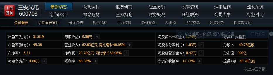 我們以上市公司三安光電為例進行企業盈利能力分析,從以下圖中可以看到,三安光電2017年三季度營業收入是62.83億元,凈利潤是23.78億元,同比增長分別是40.05%、58.96%。其芯片、LED應用品占總收入的85%以上,材料、廢料銷售、租金、物業、服務等合計約占總收入14%左右。凈利潤額可以看出利潤規則增減情況,主營業務(利潤結構)可以分析企業管理效率、科研實力、市場競爭力及預測企業利潤變化趨勢。