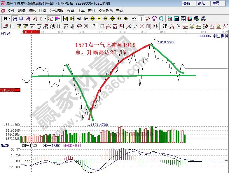 年初,主板凌厲上沖時,創業板也跟著上升,但升幅只有4%左右,但接下來的調整,卻非常凌厲,超過9%、接近10%——這一階段主要是被道指高位下破所影響,創業板是明顯落后主板的;而后,與滬深主板持續疲弱不同,創業板走出了一波凌厲的上沖行情,從最低點的1571點一氣上沖到1918點,升幅高達22.1%。按23號低點算起,從高點又回撤了近10%。