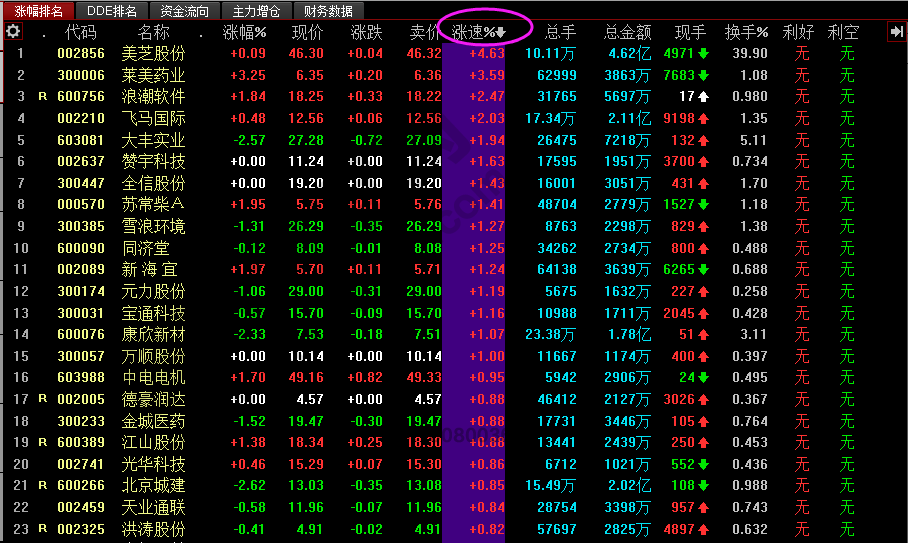 盤中個股的表現都不同,3000多只個股我們怎么從中找出來適合的短線異動個股?這里可以重點關注一個點,即個股的漲速。通常情況下關注排在看盤軟件首頁的漲速大的個股。當個股在短時間快速異動,必定是有突發的情況影響,比如盤中的突發消息,或是龍頭個股帶動的板塊聯動,或是資金的介入等等,所以觀察個股的漲速,大海撈針,找到要做二步分析的標的。