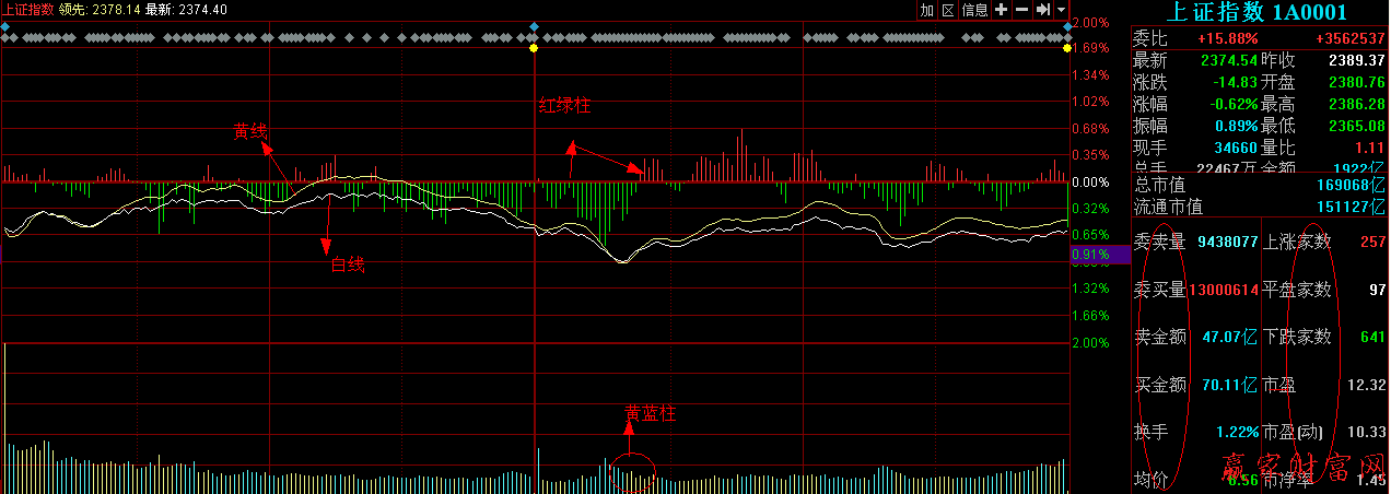 4)黃色柱線:在紅白曲線圖下方,用來表示每一分鐘的成交量,單位是手(每手等于100股)。