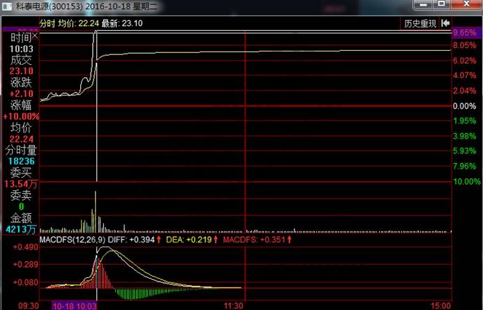 我們看一張科泰電源的分時走勢圖,該股在攻擊板上的時間是在上午10點03分,如下圖所示,我們在對比一下與之同一時間漲幅在兩個點左右的科恒股份。