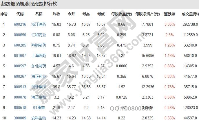 除此之外,超級細菌概念股還包括東北制藥000597、海正藥業(yè)600267、麗珠集團000513等上市公司,更多相關內容大家可以關注贏家財富網(wǎng)概念欄目。
