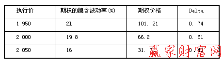 賣出1手執行價為1 950看漲期權,買入2手執行價為2 050的看漲期權,從而建立比率為2:1的看漲期權反套利,頭寸的Delta為-0.12,初始投資收益為3 779。如果標的指數下降到1950下方,那么所有的看漲期權都將無價值過期,投資者就會獲初始的投資收益3779(不算手續費的話)。如果標的指數價格上漲至買人期權的執行價時,投資者將遭受該策略的最大損失。