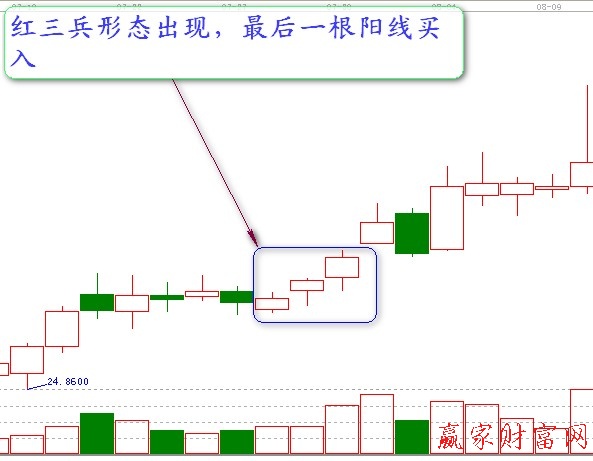 股價(jià)出現(xiàn)紅三兵形態(tài)時(shí),往往暗示著股價(jià)即將進(jìn)入一個(gè)新的上漲行情。因此當(dāng)該形態(tài)形成之后,我們即可積極買入股票。