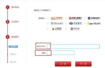 三、要上傳自己的身份證照片,正反面照片都需要上傳,要記得把照片拍清楚一點(diǎn),如果不清楚的話就要把身份證照片重新上傳一下,還要選擇你的三方存管銀行卡,之后再輸入卡號(hào);
