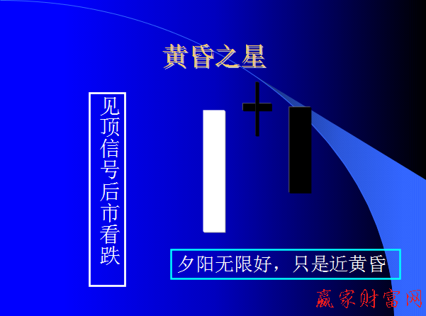 黃昏之星:市場在持續的漲勢之后,已激情不再,就像再好的筵席也有散場之時。黃昏之星的圖形,預示市場趨勢已經見頂,賣出的時機悄然來監。