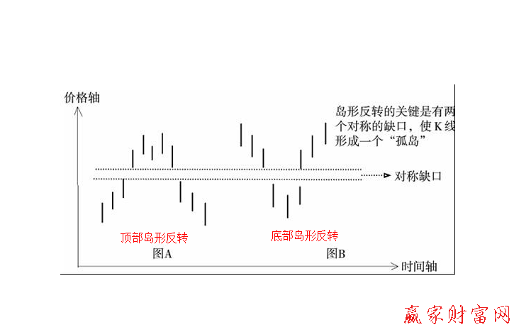 股價在經過持續上升一段時間后,某日出現跳空缺口性加速上升,但隨后該股股價在高位震蕩,不久股價在以向下跳空缺口的形式下跌,而這個下跌缺口和上升向上跳空缺口,基本處在同一價格區域的水平位置附近,使高位爭持的區域在K線圖表上看來,就像是一個孤島形狀,左右兩邊的缺口令這島嶼孤立地立于海洋之上,這就是頂部的島形反轉形態;反過來,如果在底部出現這樣的走勢,稱之為“底部反轉形態”