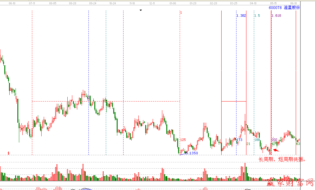 B. 當(dāng)選用的長(zhǎng)周期和短周期所指向的位置為同一位置時(shí),該點(diǎn)即為市場(chǎng)的最為重要的位置。時(shí)間大致為長(zhǎng)、短周期重疊的時(shí)間位置。 【如上圖】