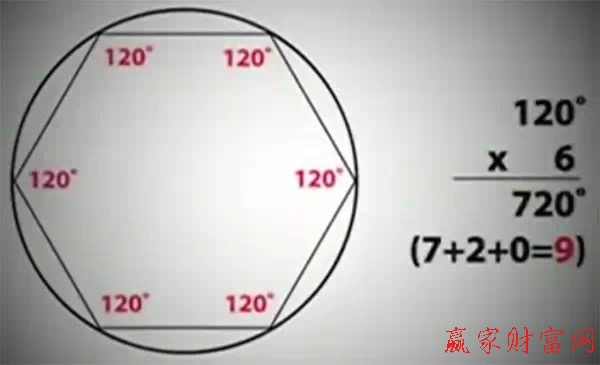 那么0-9的數字是不是有什么神奇秘密呢?下面看正五邊形和六邊形的角度之和。