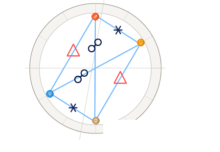 所以,“圖形相位”就是以特別圖形形狀展現的相位組合,包括群星匯聚(Stellium)、三刑會沖(T-Square,也被稱為“T 三角”)、大三角(Grand Trine)、風箏相位(Kite)、大十字相位(Grand Cross)、神秘長方形(Mystic Rectangle)以及上帝手指(Yod)等等。占星圖中每一種圖形相位都由多種相位和行星的組合而成,需要達到特定條件才能成型,所以也會使圖形相位自身帶著著復雜和累加的能量。有一點需要注意,圖形相位雖然會帶來強于一般相位的能量效用,但是最終效果不僅與相位本身有關,也和參與的星體能量本身息息相關,并不能一味的以圖形相位的出現就斷言好與壞。當然,星盤中圖形相位的出現一定會令此人的人生更加精彩,帶來機遇或者危機,但最后的成就高低卻需要看星盤本身格局而定。圖形相位只會對星盤格局起到調整和加成作用。成也蕭何敗也蕭何,圖形相位自身的局限性同樣可能對命主帶來限制,不能一言以蔽之。