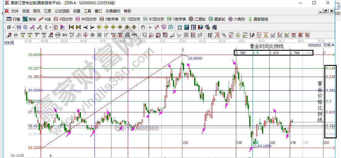 接著,自然法則是如何來影響股市的?這個(gè)無形的語言或者密碼是什么?簡單來說就是數(shù)學(xué),數(shù)學(xué)是自然科學(xué)的語言!在市場中隨處可見的黃金比例,平時(shí)分析所用的圖形、劃線等都是基于數(shù)學(xué)構(gòu)建的分析模型,借助這些數(shù)學(xué)模型,我們可以在看似無序的K線中,快速找到有序的交易信號(hào)。來一張萬科A的分析圖,雜亂的K線圖中,加上一組黃金時(shí)間比例線和黃金價(jià)格比率線,走勢(shì)中關(guān)鍵的頂部和底部位置就規(guī)規(guī)矩矩的擺在那里。當(dāng)前是處于支撐角度該買入持有,還是該高拋兌現(xiàn),清清楚楚!