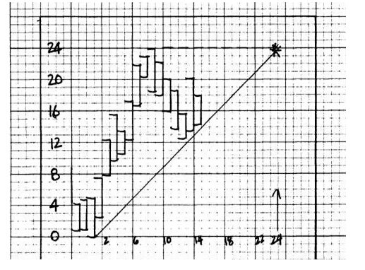 比如,當高點為570時,我們想在見到這個高點的時間點,從“0”點向上畫一條45度角趨勢線,那么我們從570這個頂點開始算起,橫著向有數570個小方格,得到的就是從“0”點發出的45度角的趨勢線結束的位置。