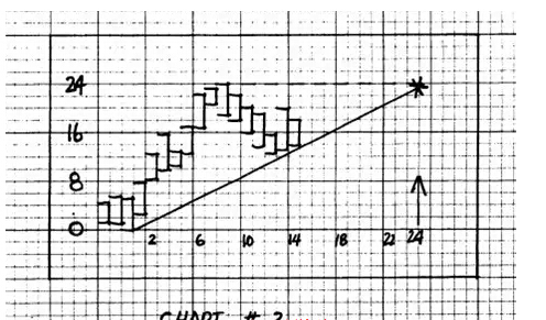 在定勢圖中,從頂部向底部畫一條45度角的趨勢線,它的價格區間為24美分,在這里就需要24天才能走出這個價格區間的正方,而就在價格與時間形成正方的時點,趨勢將會發生變化。