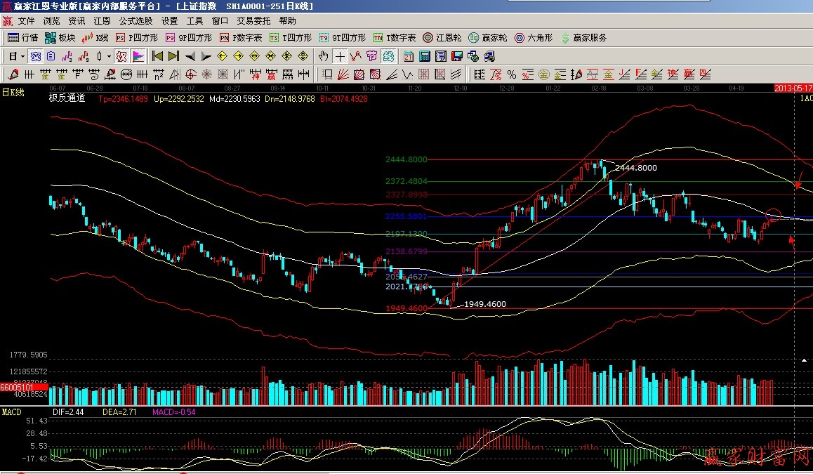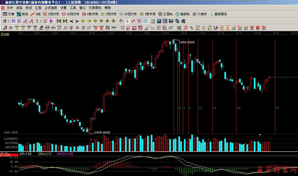 ☆依據(jù)費(fèi)氏時(shí)間周期線提示:以2444點(diǎn)時(shí)間為起點(diǎn)做圖如圖下圖,5月13號(hào)為時(shí)間窗;