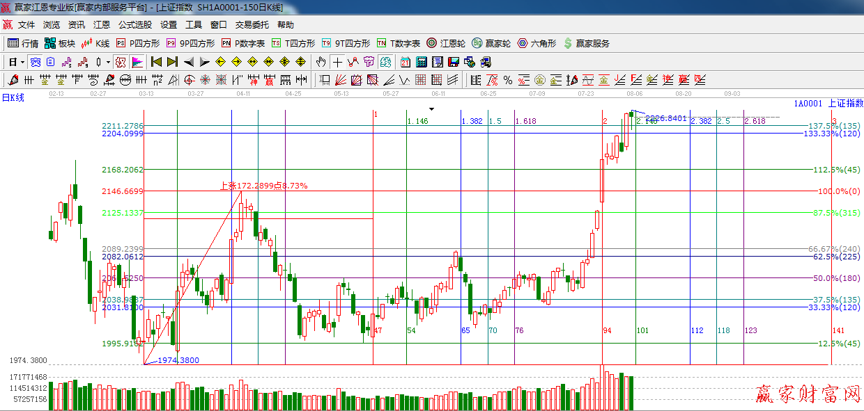 江恩看盤綜述:依據贏家江恩技術工具分析得出:目前指數一直處于極反通道外軌阻力震蕩攀升,量能同比回落,昨日藍籌股全線回調,對指數上行構成壓力,預計今日指數沖高回落,短期內或見階段小頂,操作上,合理控制倉位,做好高拋低吸。