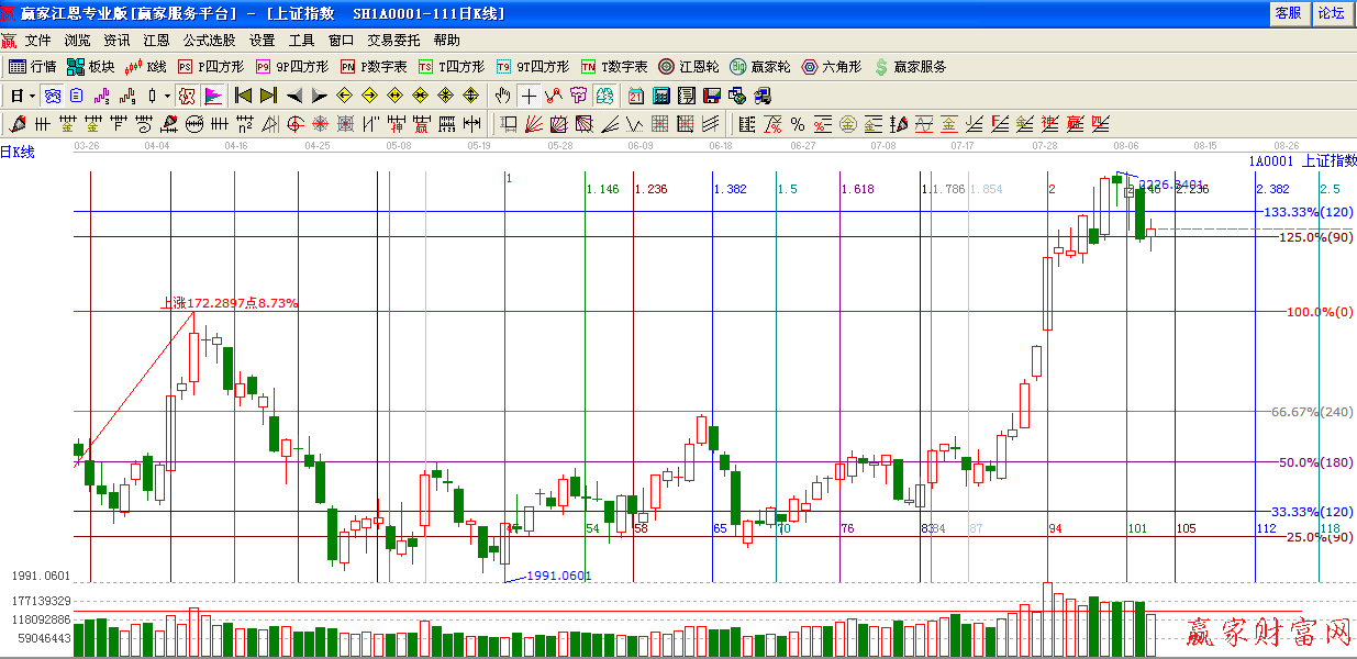 ☆依據贏家江恩系統黃金時間周期線提示:繼8月06日窗口,指數誘多,隨后指數如期中陰下跌。