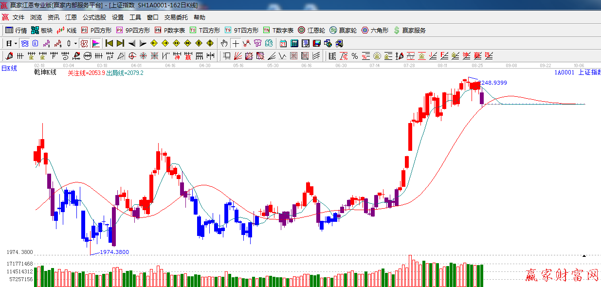 ★依據贏家江恩系統乾坤K線提示:盤中破位出局線,k線轉入紫色警示,短線看空,紅色關注線決定波段。