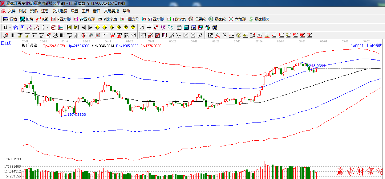江恩看盤綜述:依據贏家江恩技術工具分析得出:指數震蕩反抽,極反通道藍色外軌線,成交量漸趨萎縮,外軌線是2221點,此位置不能放量收復,市場短期將仍以震蕩反復為主,操作,謹慎為主,做好高拋低吸。