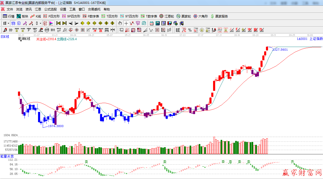 ★依據(jù)贏家江恩系統(tǒng)能量買賣提示:紅色能量柱子,看多。