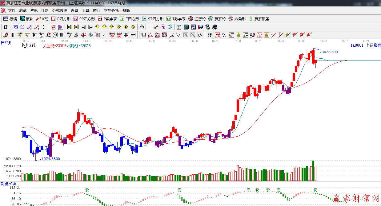 江恩看盤綜述:依據贏家江恩技術工具分析得出:指數昨日跌破2300點關口,今日回探60分鐘生命線止跌收小陽線,從盤中分時來看午后拉升的量能明顯不及早盤的量能所以短期一兩天將繼續高位震蕩為主,預計19日最后一個小時將明確短線方向.