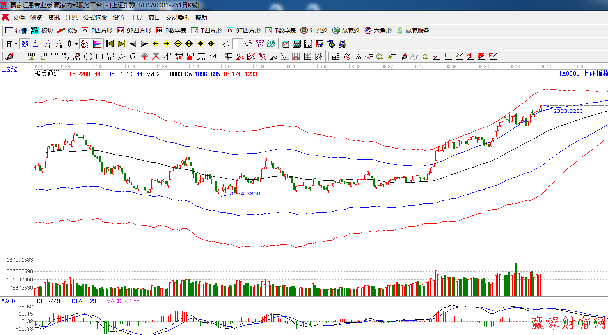 江恩看盤綜述:依據(jù)贏家江恩技術(shù)工具分析得出:滬深兩市貼著極反通道外軌線震蕩上揚(yáng),今日滬指刷新20個月來新高,依據(jù)規(guī)則藍(lán)色外軌線不破,后期趨勢繼續(xù)向好,明日關(guān)注90度2376點(diǎn)支撐,此位置整理不破看高一線,江恩120度2411點(diǎn)。