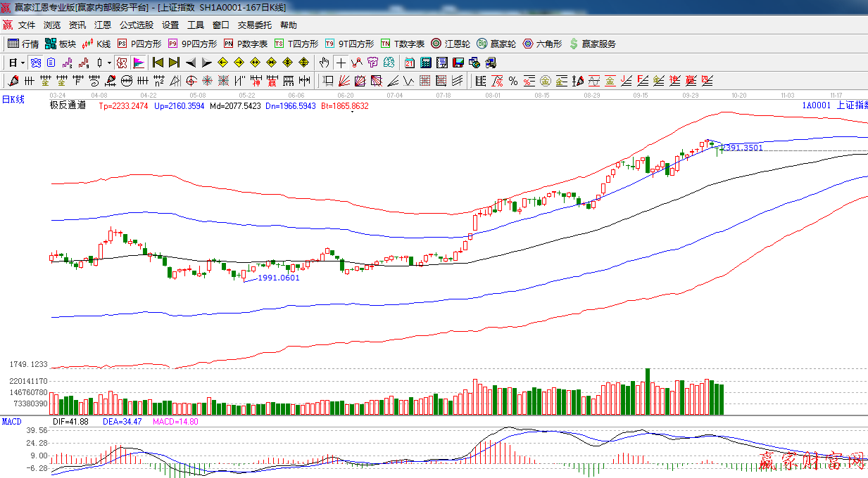 ★依據贏家江恩系統極反通道提示:在藍色外軌線之下,收陰十字星,短期謹慎為主。