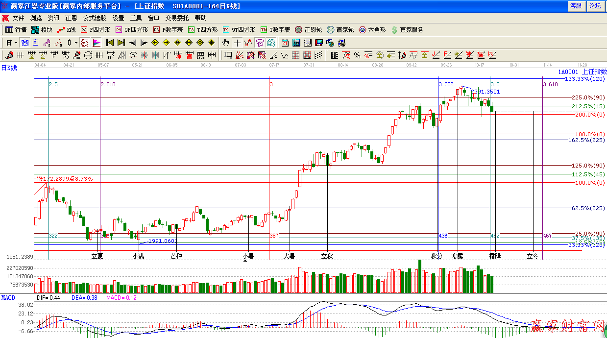 江恩看盤綜述:依據(jù)贏家江恩技術(shù)工具分析得出:周三上證如期反抽2350附近,隨后由于量能不支展開回落,明今日是霜降節(jié)點(diǎn),預(yù)計(jì)今日指數(shù)或?qū)⑿》降缀蠡爻椋路街谓?度位置2318附近,生命線2290附近。操作上,嚴(yán)格控制倉(cāng)位,考慮進(jìn)行高拋低吸打差價(jià)。