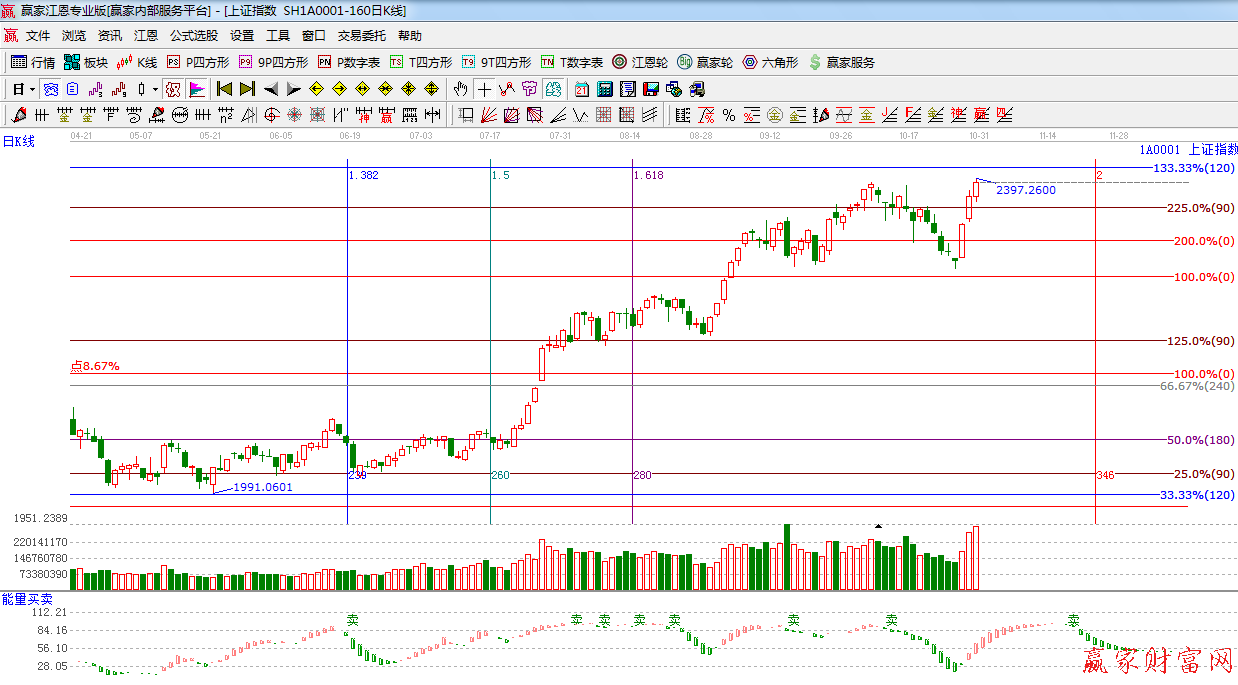 ☆依據贏家江恩系統波段百分比提示:指數繼續震蕩走高,突破前期高點2391點,下一阻力位是江恩120度2410點,