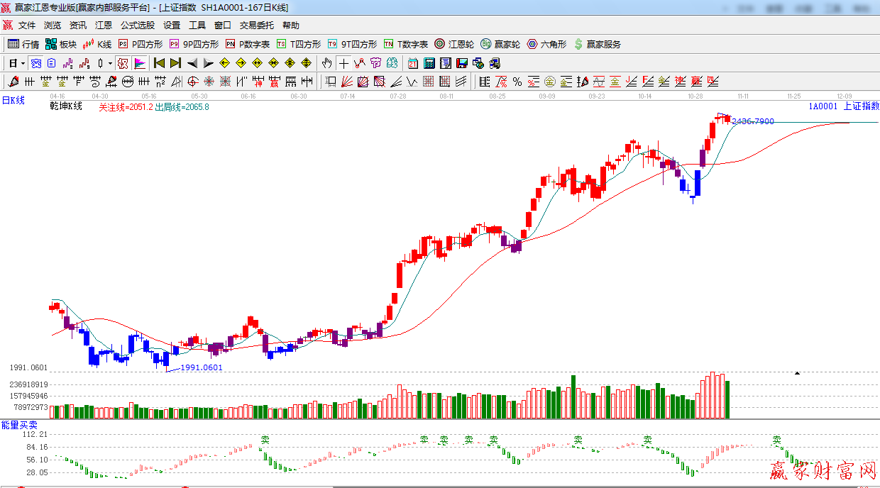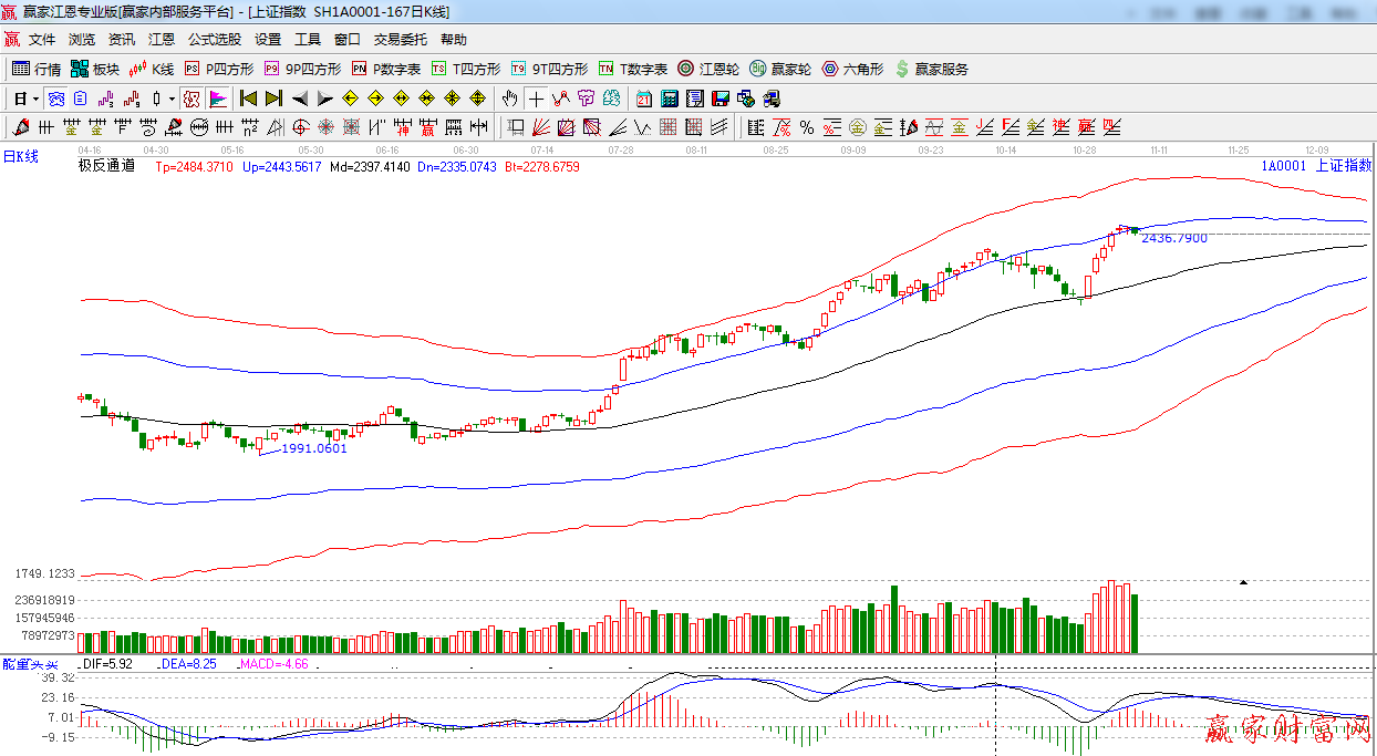 ★依據贏家江恩系統極反通道提示:今日收盤破位藍色外軌線,短期注意風險。