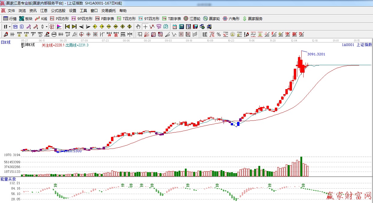☆依據(jù)贏家江恩系統(tǒng)能量買賣提示:綠色看空能量柱出現(xiàn),短線看空,謹(jǐn)慎為主。