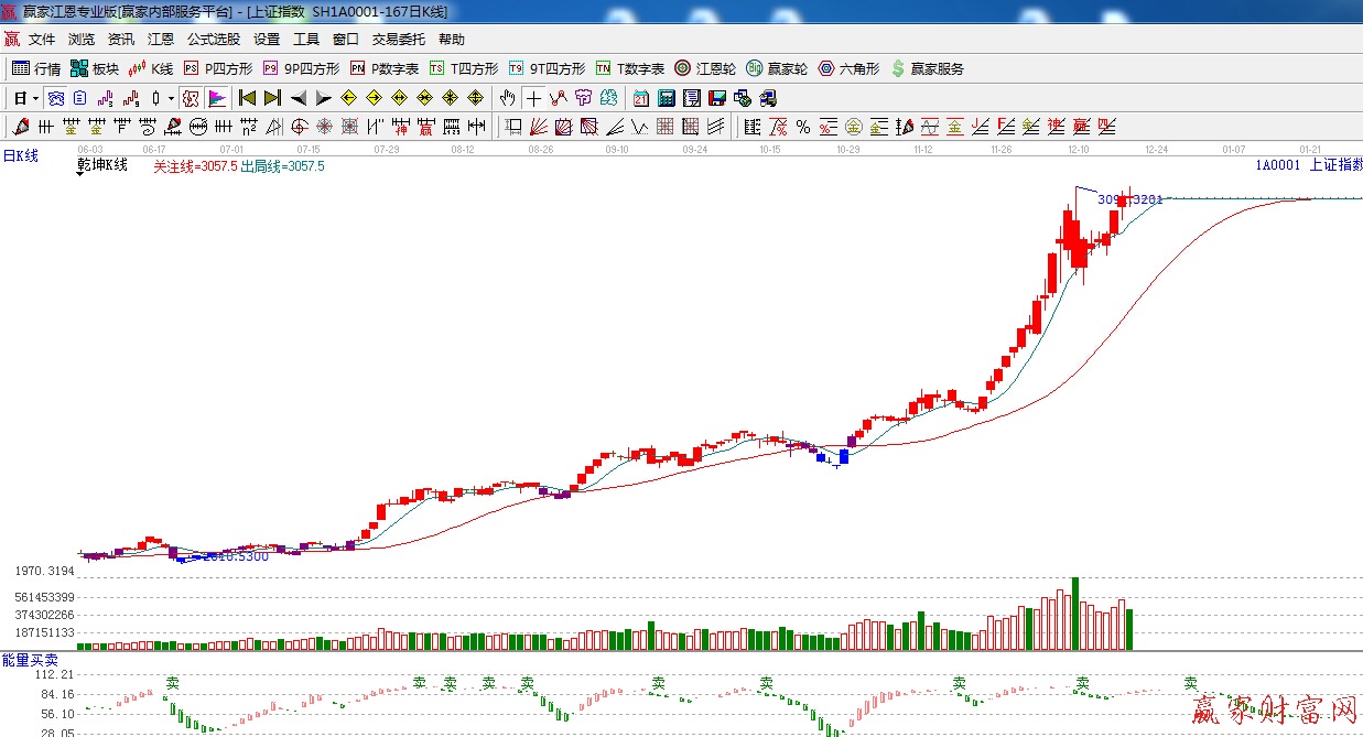 ★依據贏家江恩系統乾坤K線提示:紅色區域,綠色出局線之上,趨勢看多