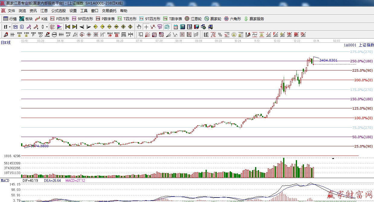 ☆依據贏家江恩系統波段百分比提示:指數破位江恩180度支撐線,下方支撐是江恩90度度,3192點,上方阻力依然是江恩240度,270度,3440點,3490點。