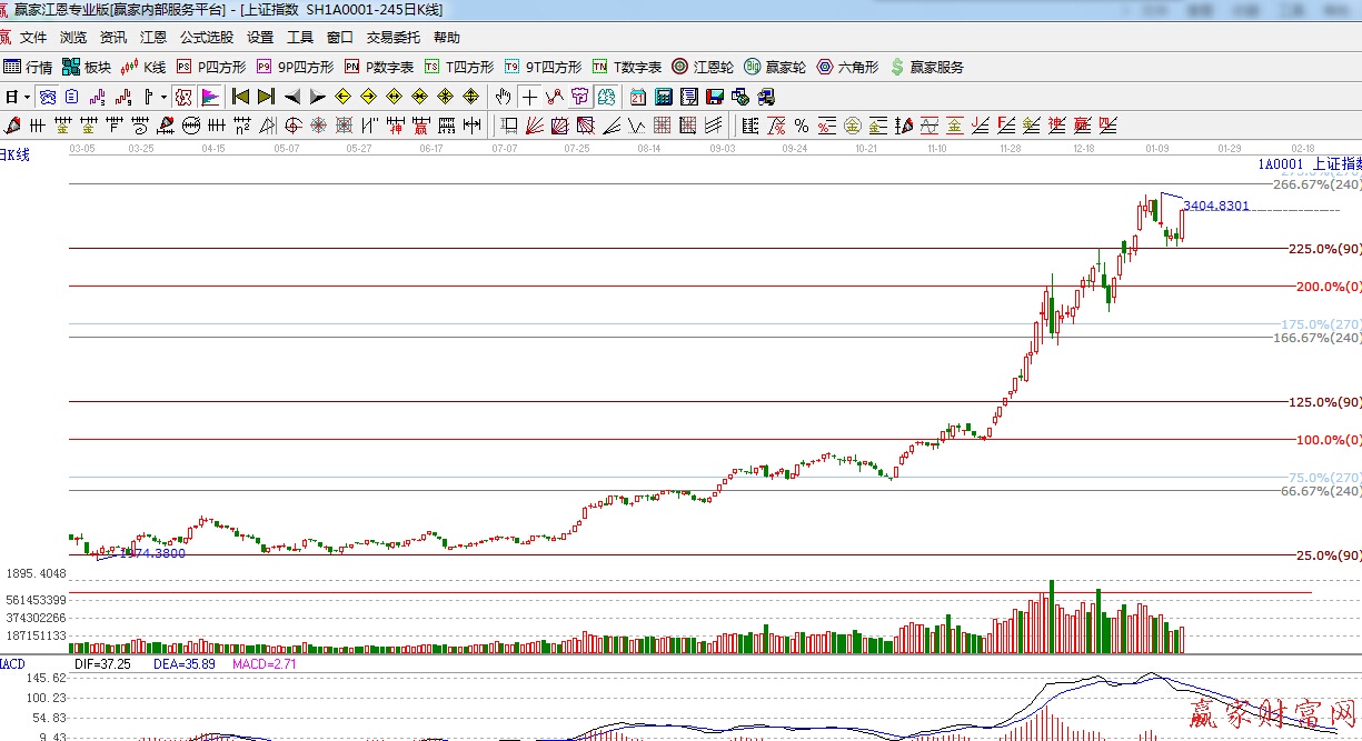 ★依據(jù)贏家江恩理論系統(tǒng)波段百分比提示:滬指在江恩90度支撐位經(jīng)過兩日縮量十字星后,如期反彈,上方阻力是240度,270度 ,3440點(diǎn),3490點(diǎn)。