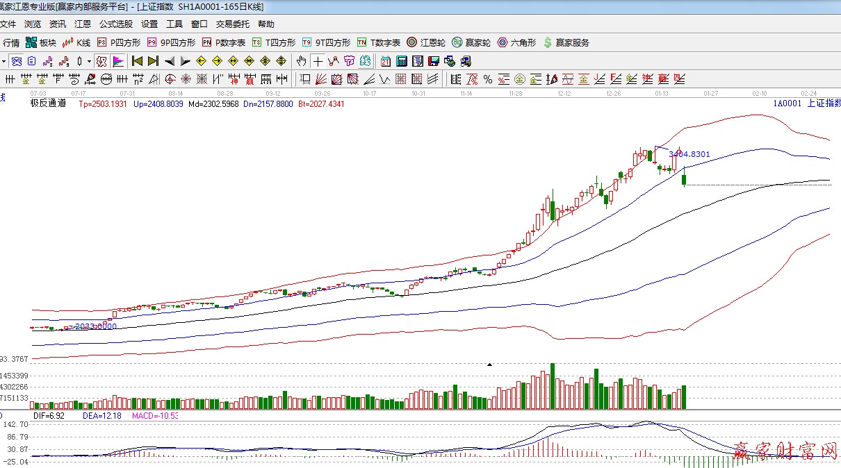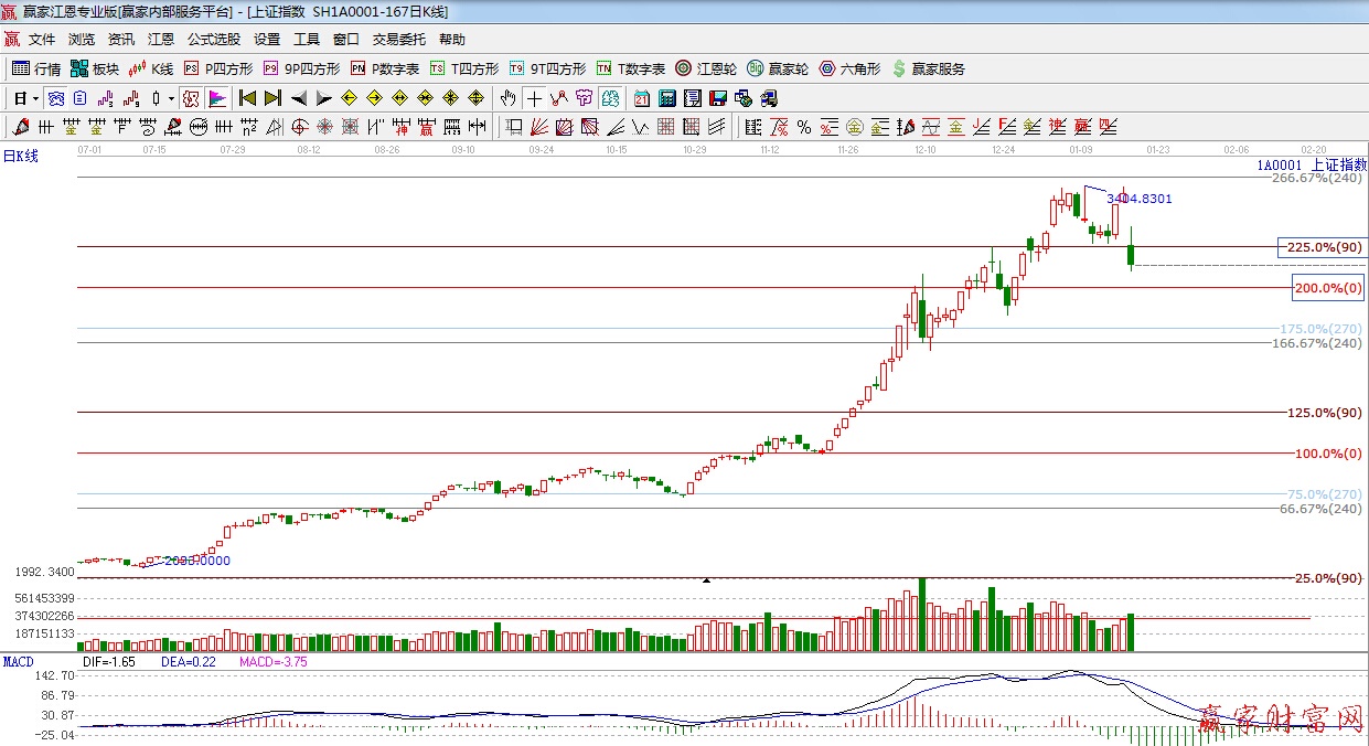今日市場受利空消息影響,滬深兩市出現大幅下挫,權重股中的券商,銀行,保險等全線跌停,煤炭、石油等權重板塊也大幅下跌,截至收盤,滬指跌7.70%報3116點;深成指跌6.61%報10770點。盤面上,兩市個股超2000只下跌,市場人氣遭受重創,技術面,今日盤面上的重挫是市場強勢上漲過程中的震蕩,需冷靜面對,按照江恩百分比分析:滬指盤中破位江恩90度3188點,明天下方支撐位是江恩0度位置3039點附近,加之明天是節氣“大寒”的時間窗口,滬指將會在江恩0度支撐附近止跌回穩,然后重新步入前期的強勢,但券商等權重股走勢或將暫告一段落,指數后期將呈現震蕩上行的慢牛格局。市場熱點將會轉入中小盤。