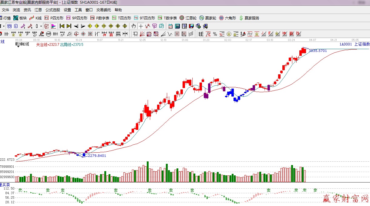 ★依據(jù)贏家江恩理論系統(tǒng)乾坤K線提示:紅色k線,綠色線上方,留意綠色短線出局線得失。