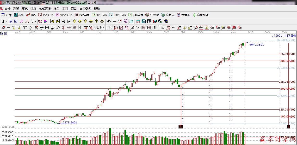 ★依據贏家江恩理論系統波段百分比提示:依據規則下一目標位是江恩270度4081點,下方支撐江恩90度是3783點。