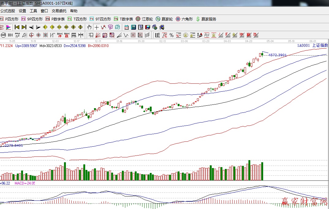 江恩看盤綜述:依據(jù)贏家江恩技術(shù)工具分析得出: 周二滬深兩市震蕩加劇,盤面顯示整體市場分化嚴重,藍籌股相對較強,創(chuàng)業(yè)板出現(xiàn)下跌,在滬指連續(xù)的逼空的情況下,又恰逢五一假期,短期震蕩調(diào)整實屬正常,下方極限位置是江恩180度4300點,震蕩整理之后仍會繼續(xù)向上攻擊江恩270度4700附近。操作上,逢低仍是調(diào)倉以及布局良機,金融股首選銀行、券商;另外,煤炭、有色、電力、化工也可逢低關(guān)注。