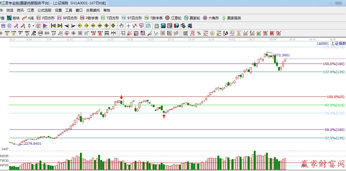 ★依據(jù)贏家江恩理論系統(tǒng)波段百分比提示:滬指如期在江恩135度4088點(diǎn)附近,止跌回升,突破180度4300點(diǎn),180度轉(zhuǎn)換為支撐位置。