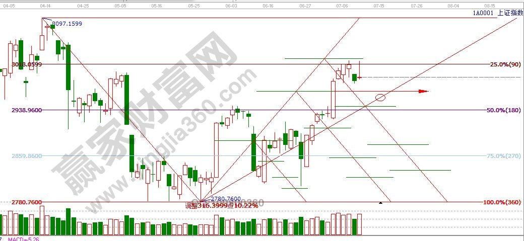 江恩看盤綜述:依據贏家江恩技術工具分析得出:周一滬指再次反抽90度3018點附近,由于量能不濟再次回落,短期繼續回落洗盤概率較大,下方支撐關注轉折趨勢線2970點附近,其次是趨勢線2950點附近。時間上,7月7日小暑窗口后,下一時間窗口是14日左右。逢低要敢于積極低吸,操作上,重點關注中報高送轉標的,以及底部啟動的滯漲品種的補漲機會。