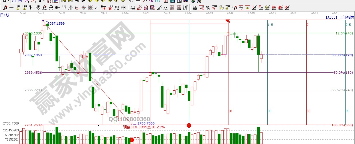 江恩看盤綜述:依據(jù)贏家江恩技術(shù)工具分析得出:周二大盤放量大跌至日線生命線和180度共振支撐位置,此位置下跌為洗盤性質(zhì),不必過于恐慌,周四的回升預(yù)示短期修復(fù)行情的展開,支撐依然是2939點附近,時間上8月1日是一個關(guān)鍵窗口,短期修復(fù)后震蕩上行仍是大勢所趨,操作上,重點關(guān)注當(dāng)下業(yè)績支撐明顯的標的股。