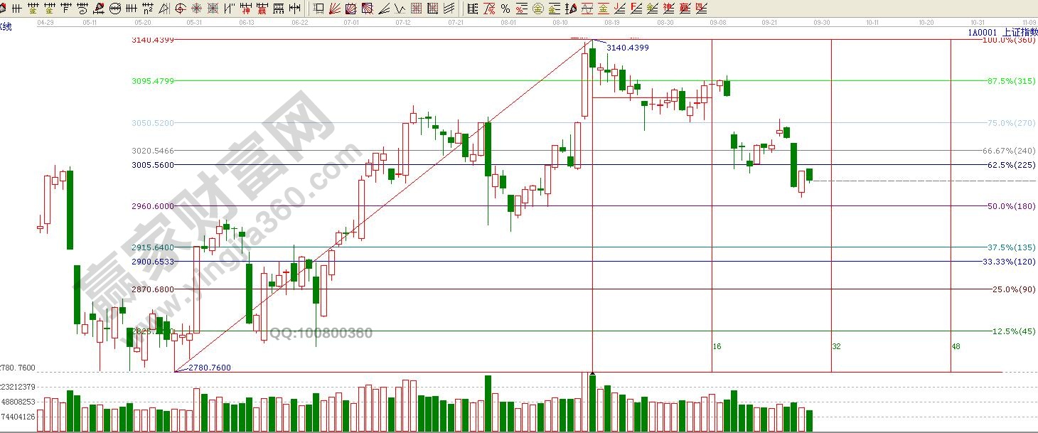 ★依據(jù)贏家江恩理論系統(tǒng)江恩波段百分比線提示:以2780點到3140點做波段百分線,探底回升,最低點位2969點,短線支撐留意2980點,阻力位225度3005點,240度是3020點附近。