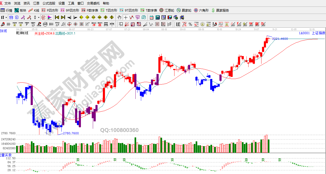 ★依據贏家江恩理論系統乾坤K線提示:紅色區域,短線出局線之上,看多。